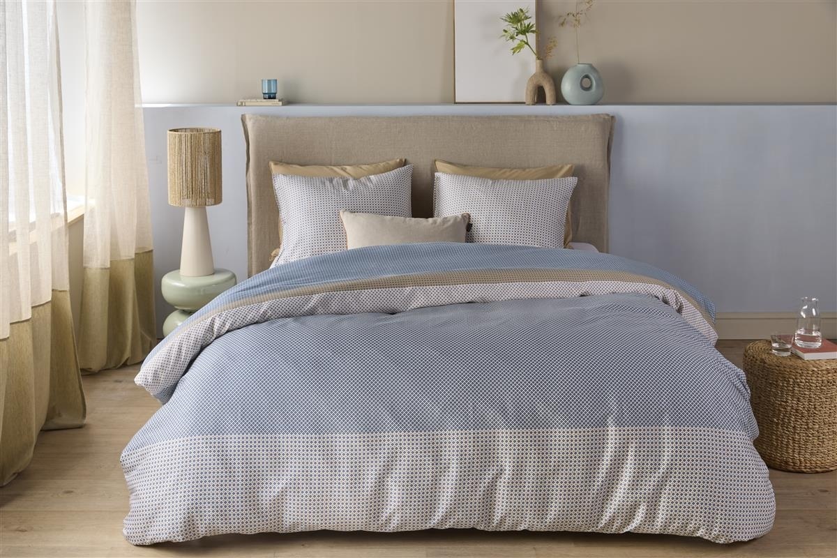 De unieke eigenschappen van dit dekbedovertrek maken het een must-have voor iedereen die waarde hecht aan kwaliteit en design. Gemaakt van katoen-satijn, biedt het een zijdezachte textuur die niet alleen comfortabel aanvoelt, maar ook duurzaam is. Het grafische dessin in een rustgevende blauwe kleur voegt een moderne en verfijnde uitstraling toe aan uw slaapkamer.