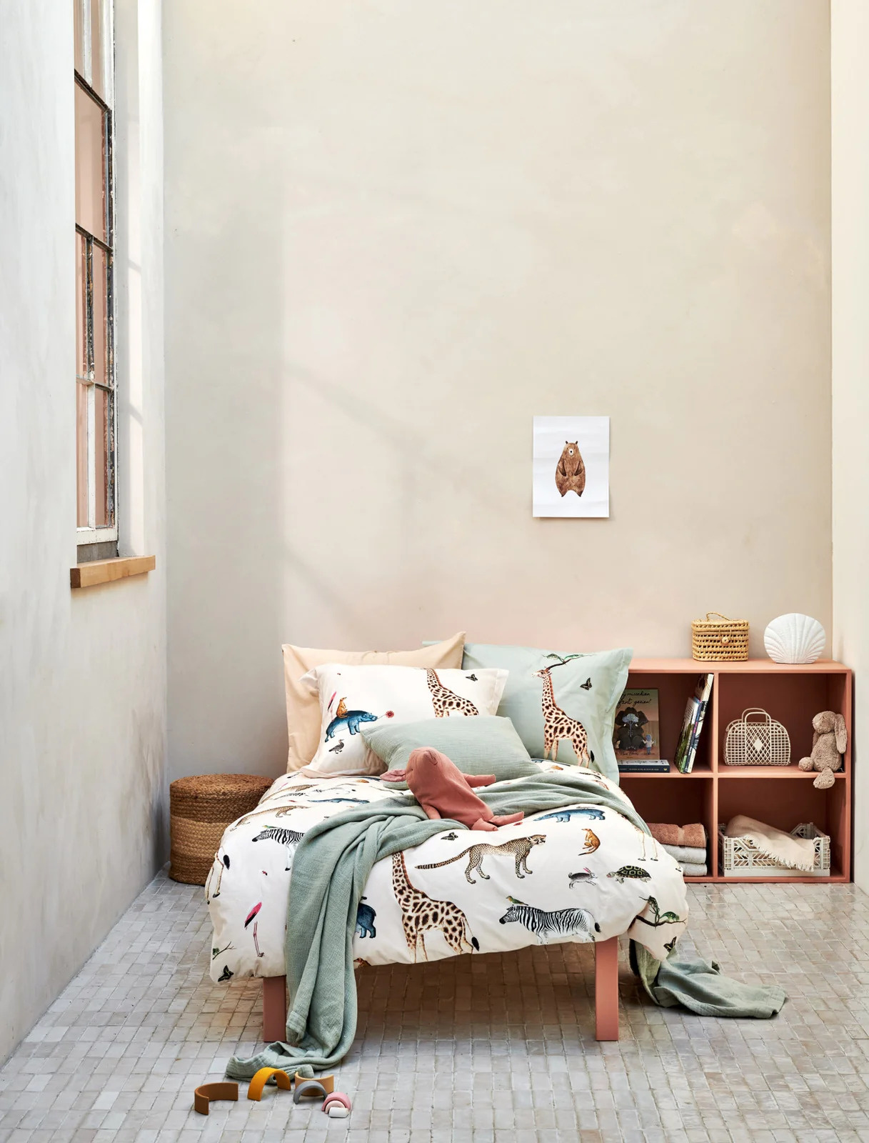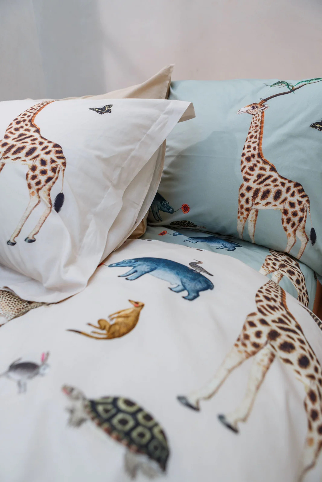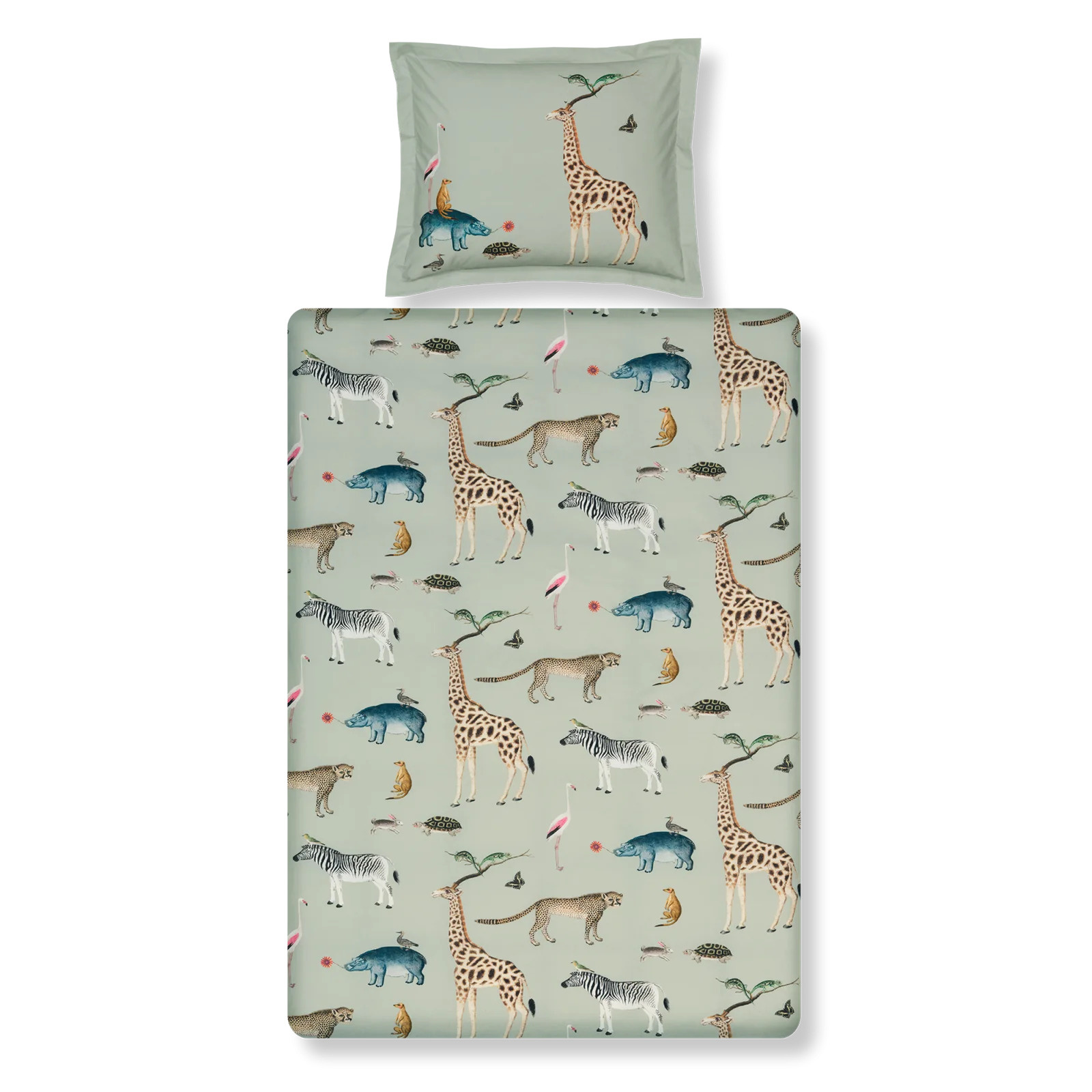 Wild Animals smoke green dekbedovertrek heeft een verzameling van safaridieren die allemaal vriendjes lijken te zijn. Heb je het stokstaartje gezien op de rug van het nijlpaard en de haas en de schildpad die plezier maken? De achterkant van het dekbedovertrek is effen lichtgroen. Het kussen heeft ook verschillende dieren op een lichtgroene achtergrond. Door de digitale druk, komt de levensechte print helemaal tot leven. Wild Animal smoke green dekbedovertrek van Vandyck brengt een vrolijke beestenbende in de kinderslaapkamer. Gemaakt van 100% katoen.